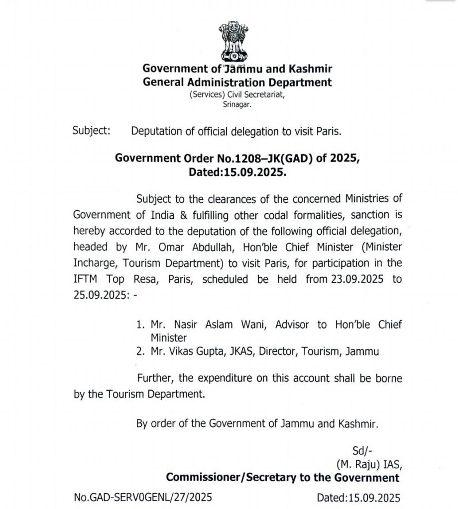 Srinagar, Sept 15: The Jammu and Kashmir Government has deputed an official delegation led by Chief Minister Omar Abdullah, who also holds the Tourism portfolio, to participate in the IFTM Top Resa tourism event in Paris from September 23 to 25.