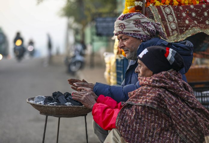 People sit near a bonfire to warm themselves during a cold winter morning, in Jammu