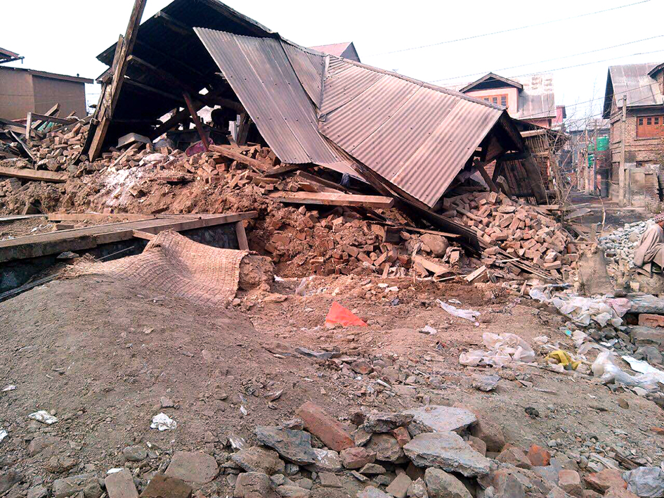 A collapsed house at New Colony in Batmaloo area of  Srinagar.