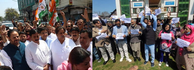 JAMMU/SRINAGAR, Apr 1: The Congress party leaders and workers today staged strong protest demonstrations at Jammu and Srinagar against the BJP-led Central Government over its alleged attempts to cripple the opposition parties ahead of the general elections.