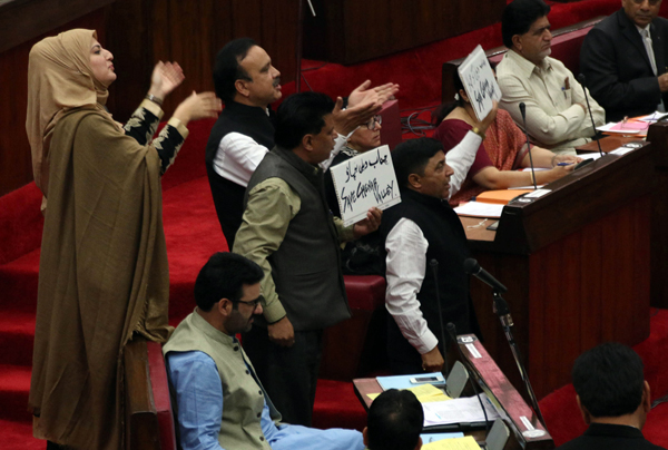 Cong and NC members protesting against Govt in Legislative Council on Monday. — Excelsior/Rakesh