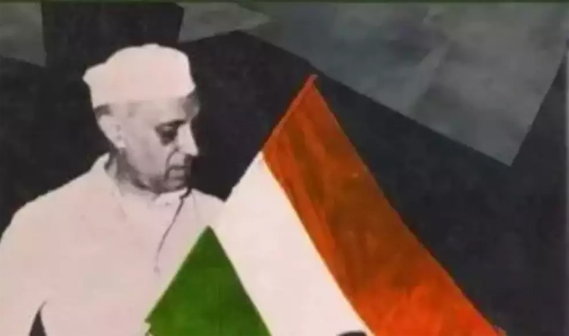 The image, likely photoshopped, was the same — a black and white photograph of Nehru looking at the flag, in colour, in his hand.