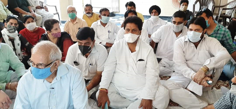 Cong leaders and others staging dharna against BJP & JMC at Panjvakhtar Temple in Jammu on Sunday. —Excelsior/Rakesh