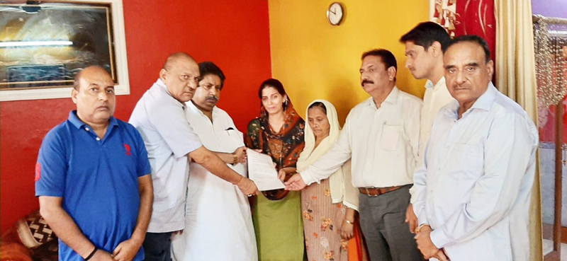 JAMMU, Oct 22: Senior Congress leaders and JKPCC vice presidents Mulla Ram, Raman Bhalla; general secretary Manmohan Singh, District Jammu Rural president Hari Singh Chib, Youth president Uday Bhanu Chib beside others today visited deceased Deepak Chand’s house in Jammu and handed over condolence letter of AICC vice president Rahul Gandhi to deceased wife expressing solidarity with the family. The condolence letter reads that Rahul Gandhi is deeply pained over his killing and that his contribution towards his students will always be remembered.