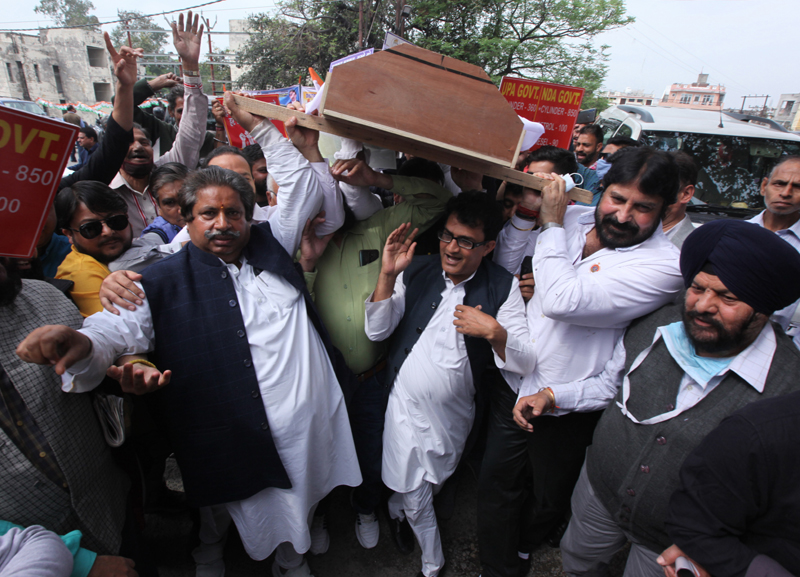 JAMMU, Mar 6: After BJP Govt took no cognizance of unprecedented hike in petroleum products, District Jammu Congress Committee today took out funeral procession of LPG cylinders against BJP Govt over continue hike in the prices of petol, diesel and LPG making life miserable for all sections of Society.