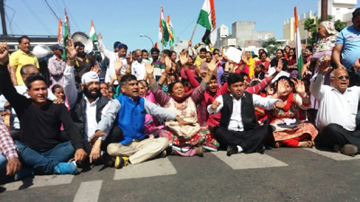 A large number of Congress activists assembled at Sarwal Chowk, carrying banners in their hands amidst chanting of slogans against Govt. They blocked the New Plot-Janipur road near Krishna Building for half an hour to mark their protest.