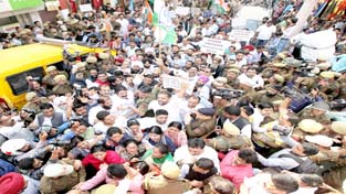 Cong workers taking out protest march towards Civil Sectt in Jammu on Monday. -Excelsior/Rakesh