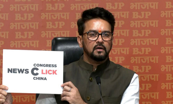 New Delhi, Aug 7: BJP leader and Information and Broadcasting Minister Anurag Thakur on Monday charged that China, NewsClick website and the Congress are linked to an “anti-India umbilical cord” as he cited a news report which alleged that companies linked to China were funding the portal.