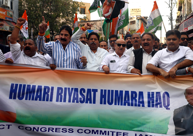 JAMMU, Mar 29: Jammu and Kashmir Pradesh Congress Committee (JKPCC) organized a massive protest march from Panjtirthi to Parade Chowk today, condemning rising terrorism in the region and demanding the immediate restoration of Jammu and Kashmir’s statehood.