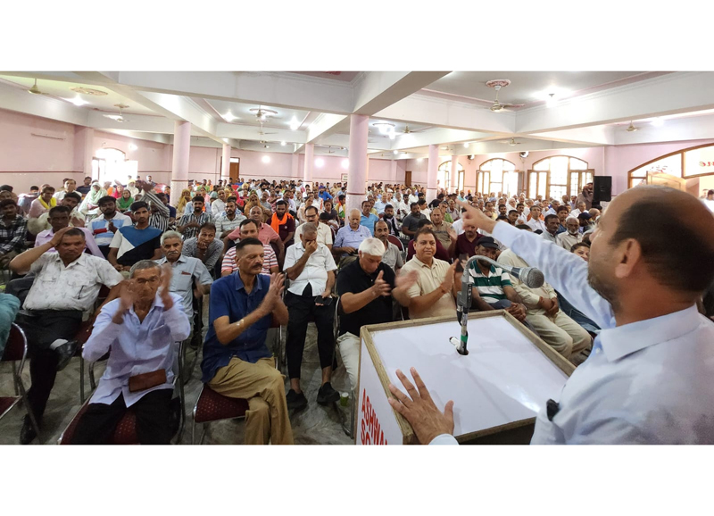 Congress leader Mohinder Bhardwaj addressing a rally at Vijaypur on Sunday.