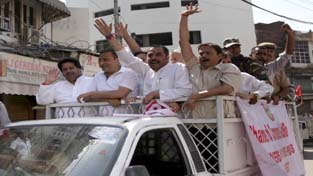 Congress leaders Raman Bhalla and Sham Lal Sharma waving to people during protest rally in Jammu on Friday. -Excelsior/Rakesh