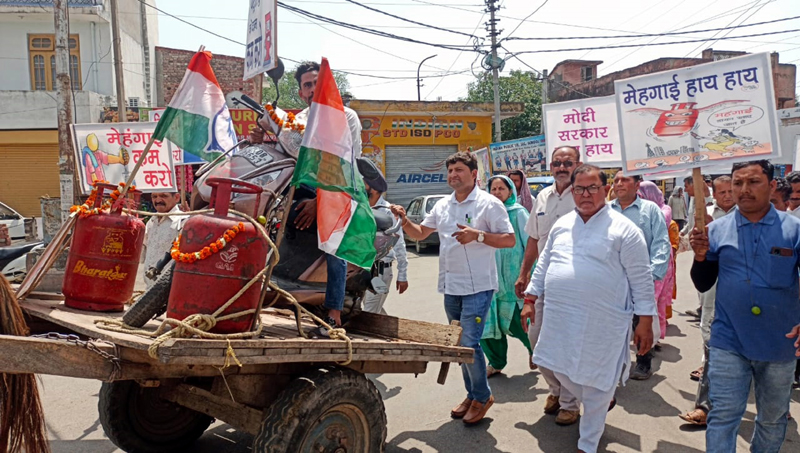 Congress staging protest over hike in fuel prices and unscheduled power curtailment by garlanding cylinders at Hiranagar on Wednesday.