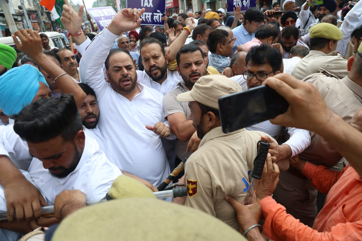 Jammu, Aug 4: The Congress on Friday took out a protest rally in Jammu against the Union territory administration and the BJP-led central government, and its workers tried to march to the Raj Bhawan but were stopped by police.