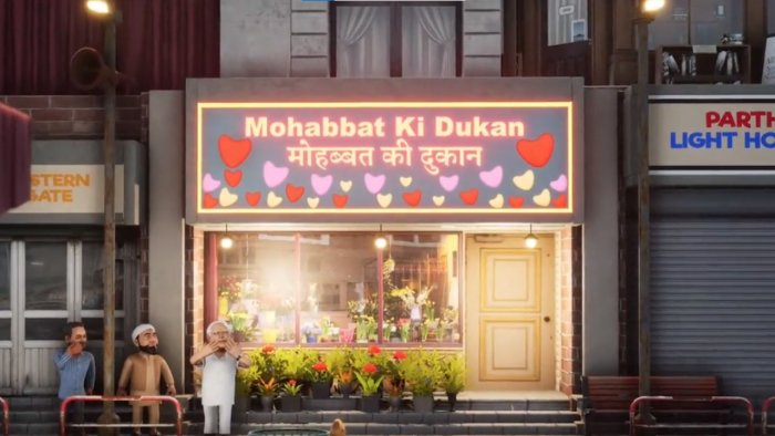 It shows Gandhi also travelling in a truck and as he passes a ‘nafrat ka bazaar’ board, it falls down and a ‘mohaabat ki dukaan’ is in the background.