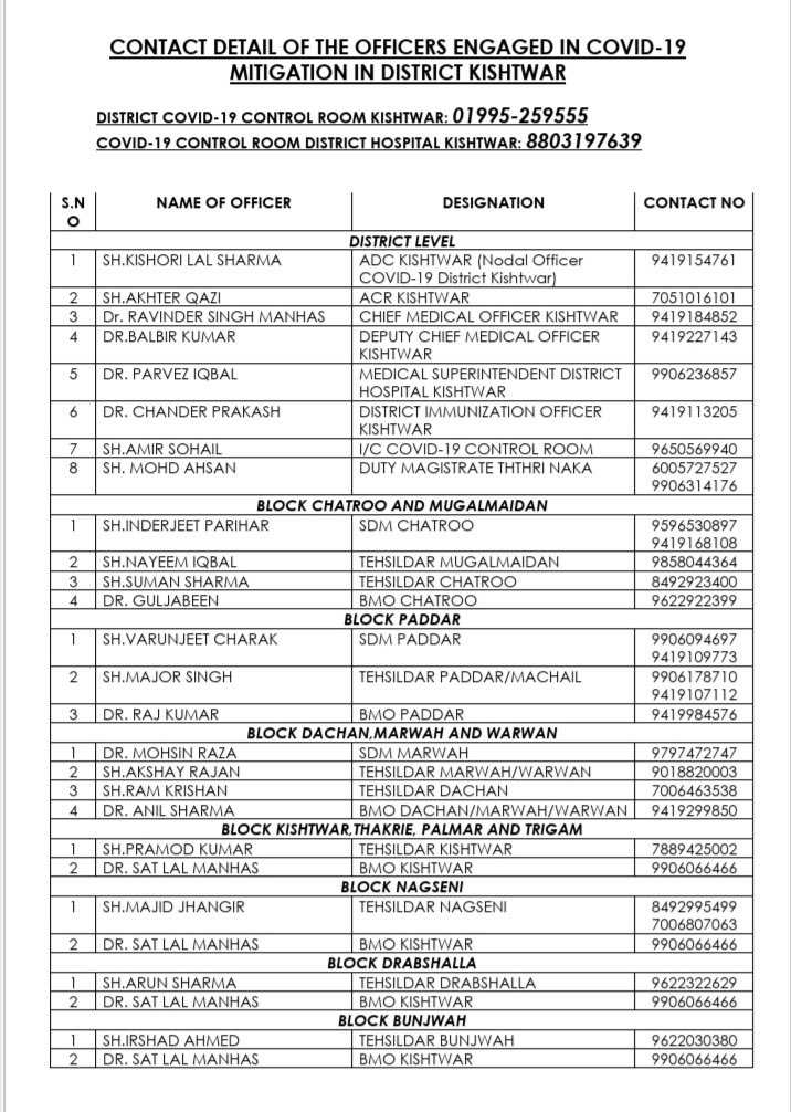 Contact details of Officer dealing with COVID Containment measures in Kishtwar By Daily Excelsior - May 13, 2021 Share FacebookTwitterWhatsAppPinterestLinkedinCopy URLTelegramEmailTumblrReddItPrintKoo Contact details of Officer dealing with COVID Containment measures in Kishtwar Follow our WhatsApp channel