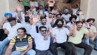 Contractors raising slogans during protest at Jammu on Wednesday.                  -Excelsior/ Rakesh