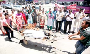Amidst raising of slogans against the State Government, the protesting Contractual Lecturers marched from Press Club Jammu to Jewel Chowk in the form of a funeral procession. They were carrying a symbolic coffin and effigy of the State Government. On reaching near Jewel Chowk, the effigy of State Government was torched.