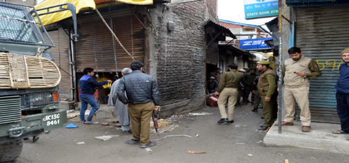 Cops at the site of firing on police party at Murran Chowk in Pulwama on Sunday. -Excelsior/Younis Khaliq