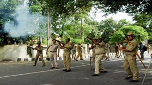 Cops firing tear smoke shells at Gandhi Nagar on Saturday.     —Excelsior/Rakesh