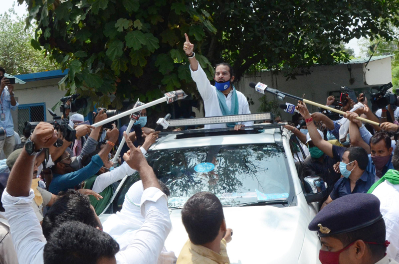 RJD leader Tej Pratap Yadav addressing party workers after the police stopped the party march from Patna to Gopalganj over a triple murder case during ongoing COVID-19 lockdown, in Patna on Friday. (UNI)
