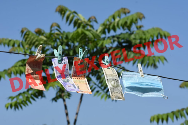Corona Fear: A man drying currency notes after sanitisation along with a mask in Mendhar town of Poonch district. -Excelsior/ Rahi Kapoor