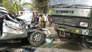 Badly damaged Tata Mobile which was hit by Army Truck near Bhambla on Sunday.