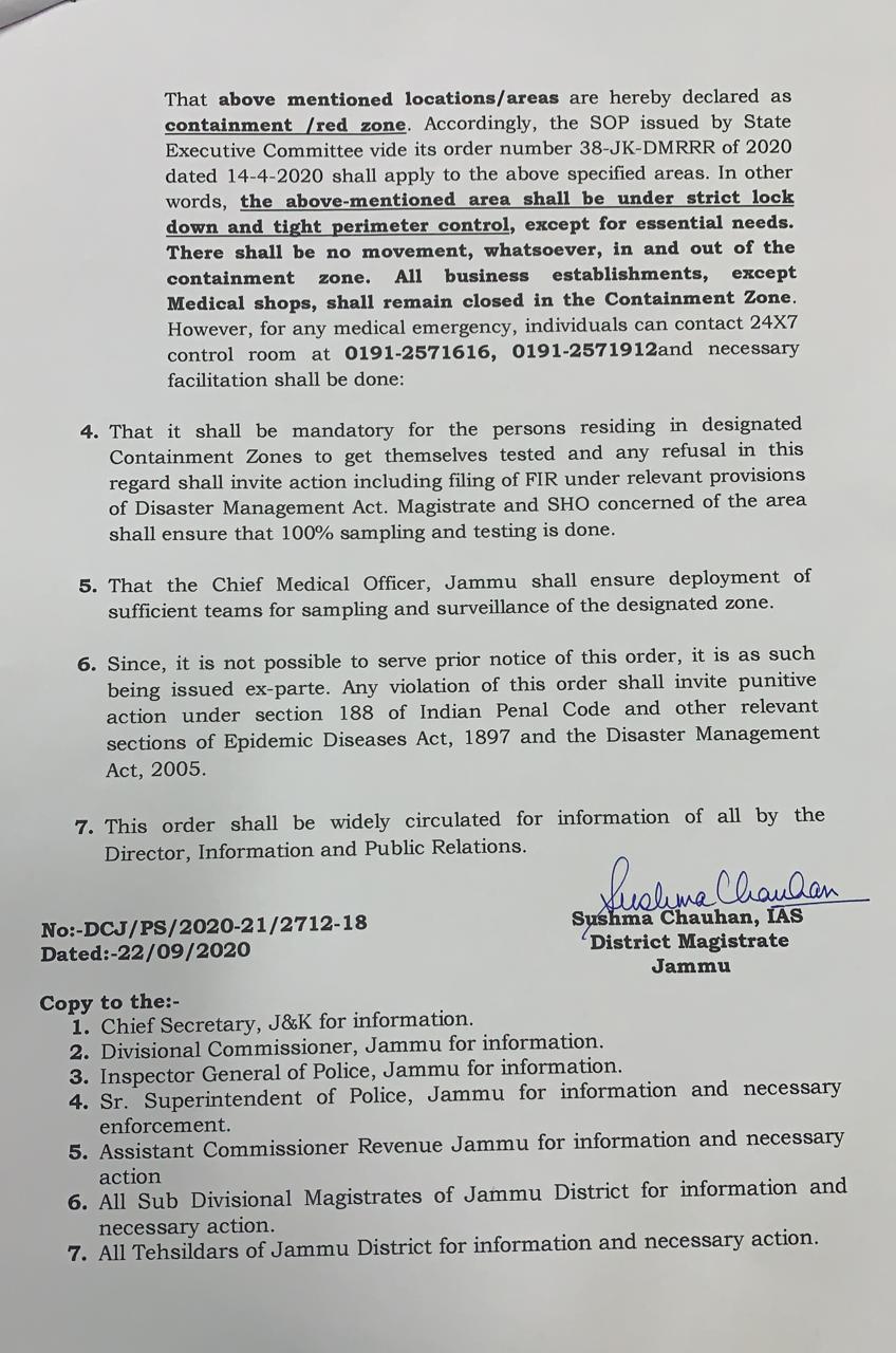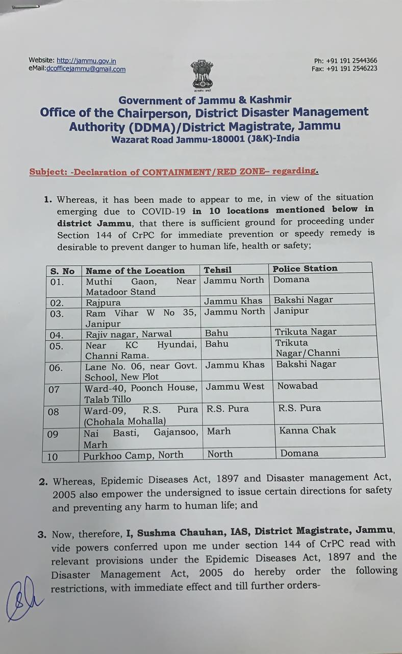 Covid-19 : Ten Locations in Jammu declared as Containment /Red Zones. By Daily Excelsior - September 23, 2020 Share FacebookTwitterWhatsAppPinterestLinkedinCopy URLTelegramEmailTumblrReddItPrintKoo In a Recent Order , Ten Locations in Jammu are declared as Containment /Red Zones Follow our WhatsApp channel