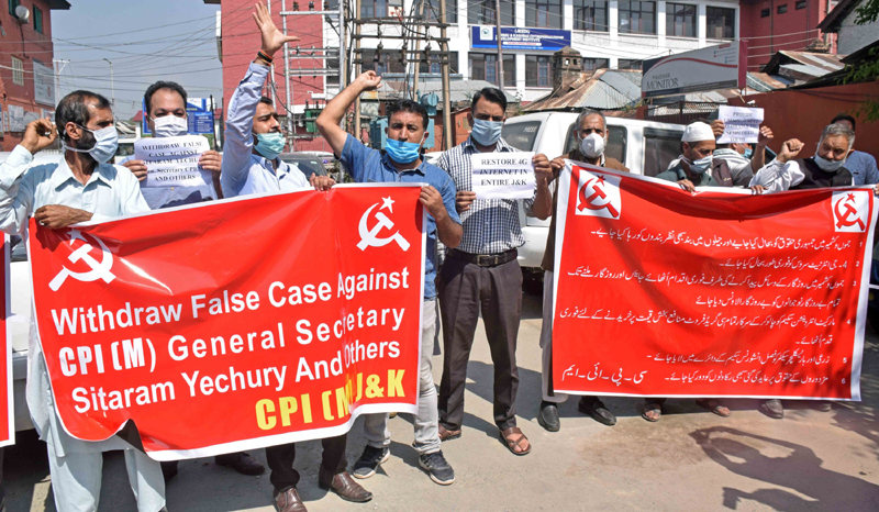 A party spokesperson said the demonstration was against the charge sheet filed against Yechury and other leaders as well as the ongoing restrictions on 4G mobile internet in the union territory.