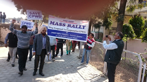 JAMMU, Feb 22: CPWD employees including Engi-neers, Architects, Horticult-urists, Draughtsmen, Office Staff and Stenographers held a mass rally today under the banner of Joint Front of CPWD Service Associations during lunch hour at CPWD Office Complex, Satwari, Jammu in protest against the recommendation made by Group of Secretaries to the Prime Minister of India to corporatize CPWD.