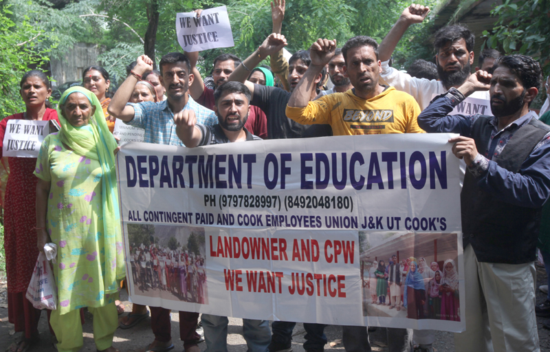 JAMMU, Sept 9: Scores of Contingent Paid Workers (CPWs), cooks and helpers under the banner of All J&K Contingent Paid and Cook Education Employees Union held a protest demonstration, here today.