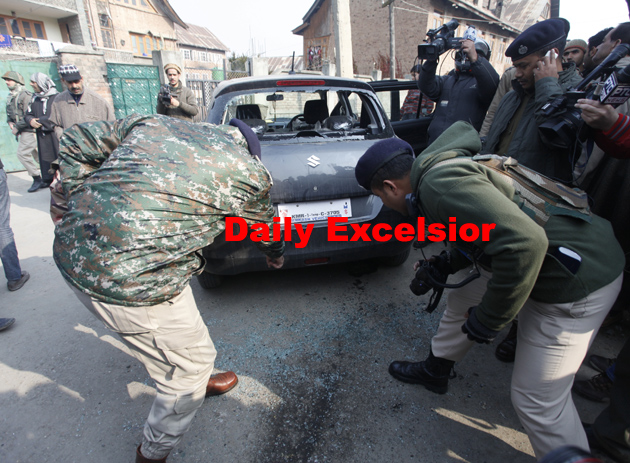 December- 17, 2015- SRINAGAR : CRPF officer inspecting a damaged vehicle after a grenade attack on a security camp by unidentified militants at safa kadal in Downtown in Srinagar on Thursday. Photo/Mohd Amin War
