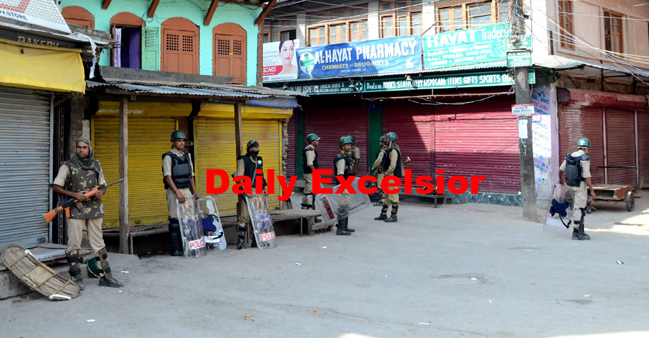 CRPF Personnal stand guard during curfew at Khanyar area of old city in Srinagar.ExcelsiorShakeel-ul-Rehman