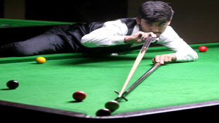 Cueist Anmol Abrol aiming a shot during a Sub Junior match at Billiards Hall, MA Stadium in Jammu on Sunday.—Excelsior/Rakesh