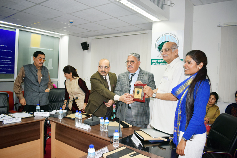 CUJ VC presenting memento to Prof K Ramachandran, Advisor AIPEA, New Delhi during a programme at the Central University on Friday.