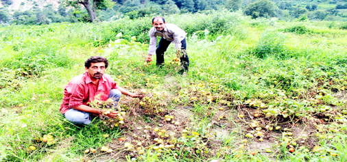 Cultivators showing damaged tomato plants after a yet to be identified disease affected the crop in Bhelruh area, one of the leading vegetable producer after Assar belt in Doda district on Monday. The disease had also affected brinjal and cucumber. (UNI)