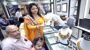 Customers evincing keen interest at the showroom of M/s Mulkh Raj Ashok Kumar Jewellers, Jammu, during Extra Discount Sale on certified Diamonds on Monday.