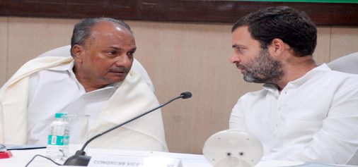 Congress vice president Rahul Gandhi in conversation with senior party leader A K Antony during the Congress Working Committee meeting in New Delhi on Monday. (UNI)