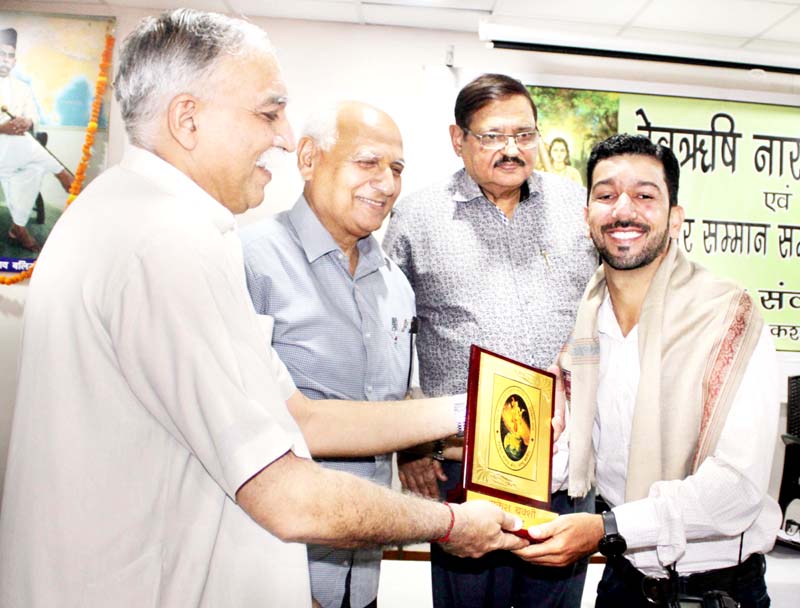 Daily Excelsior photographer, Rakesh Bakshi being presented an award of excellence during celebration of Narad Jayanti at Jammu on Sunday.