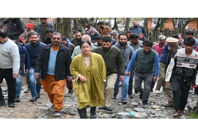 KUPWARA, APRIL 30: The Deputy Commissioner (DC) Kupwara, Ayushi Sudan on Tuesday visited flash flood hit Doban Kachama village of Kupwara district to take firsthand appraisal of the situation arisen after the breach in water reservoir, triggered by flash floods and take the on-site assessment of the flood prevention measures.