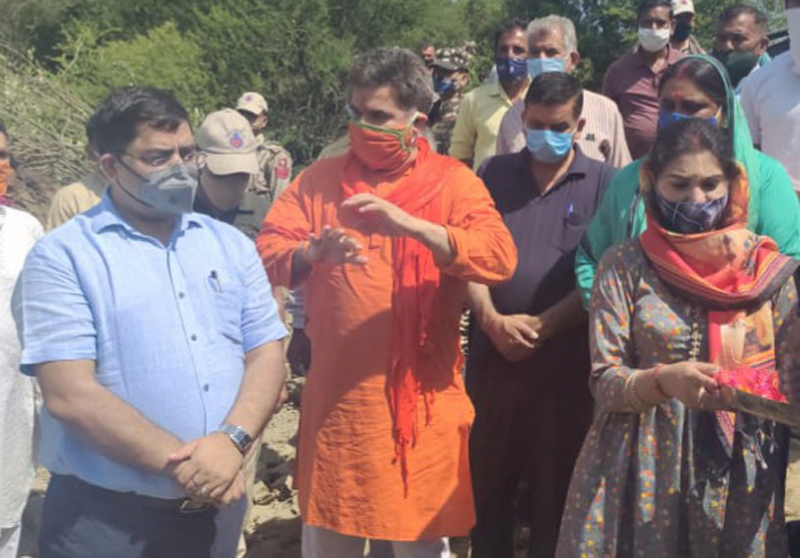 RAJOURI, Apr 29: Deputy Commissioner, Rajouri, Rajesh Shavan and DDC member, Seri Sangeeta Sharma today laid the foundation stone of a much demanded 100-meter span bridge from Dharat to Lamberi.