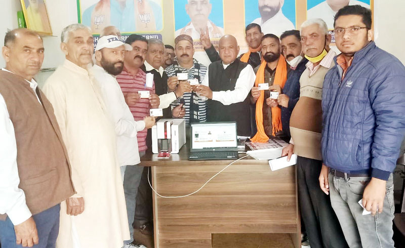 DDC chairman Bharat Bhushan alongwith Kissan Morcha president Omi Khajuria distributing Ayushman cards among people at Kangar Morh on Saturday.