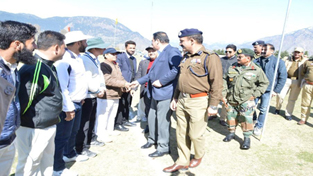 DDC Kishtwar Ghulam Nabi Balwan interacting with players and officials while inaugurating 7th Police Martyrs Cricket Tournament at Chowgan ground in Kishtwar on Wednesday.