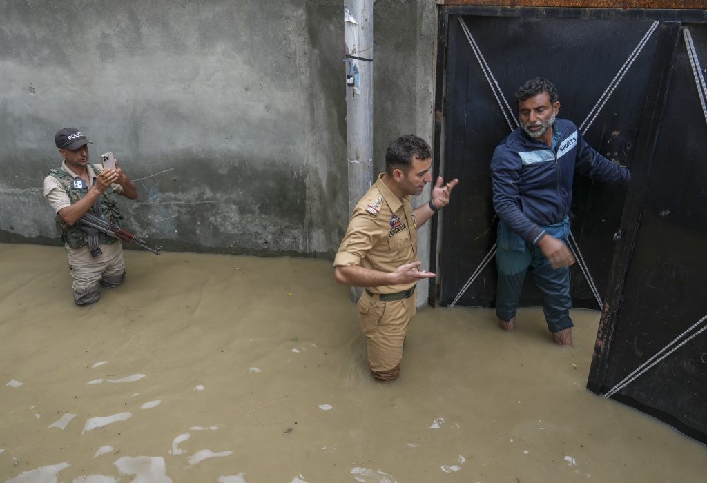 Police personnel at a flooded residential area as they urge a resident to move to a safer place following an increase in the level of River Jhelum amid heavy rains, in Srinagar.