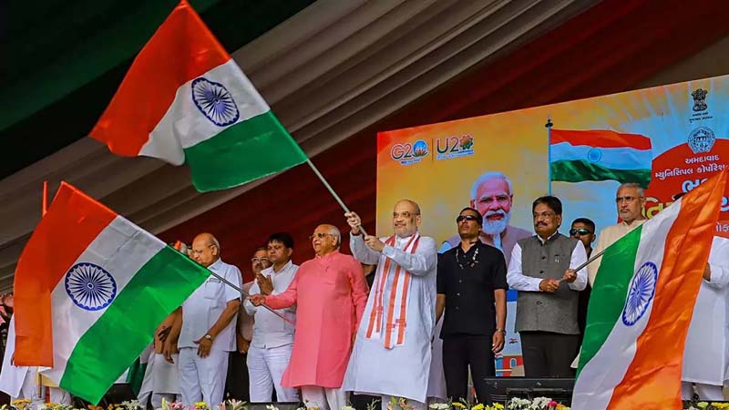 Shah and Gujarat Chief Minister Bhupendra Patel flagged off the ‘Tiranga Yatra’ organised by the Ahmedabad Municipal Corporation (AMC) in the city.