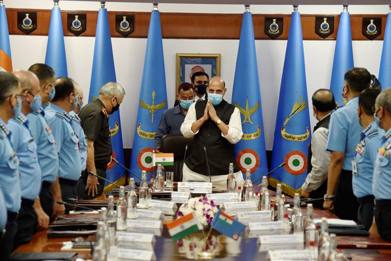 The meeting is currently underway at Vayu Bhawan in the national capital, which was addressed by Defence Minister Rajnath Singh.