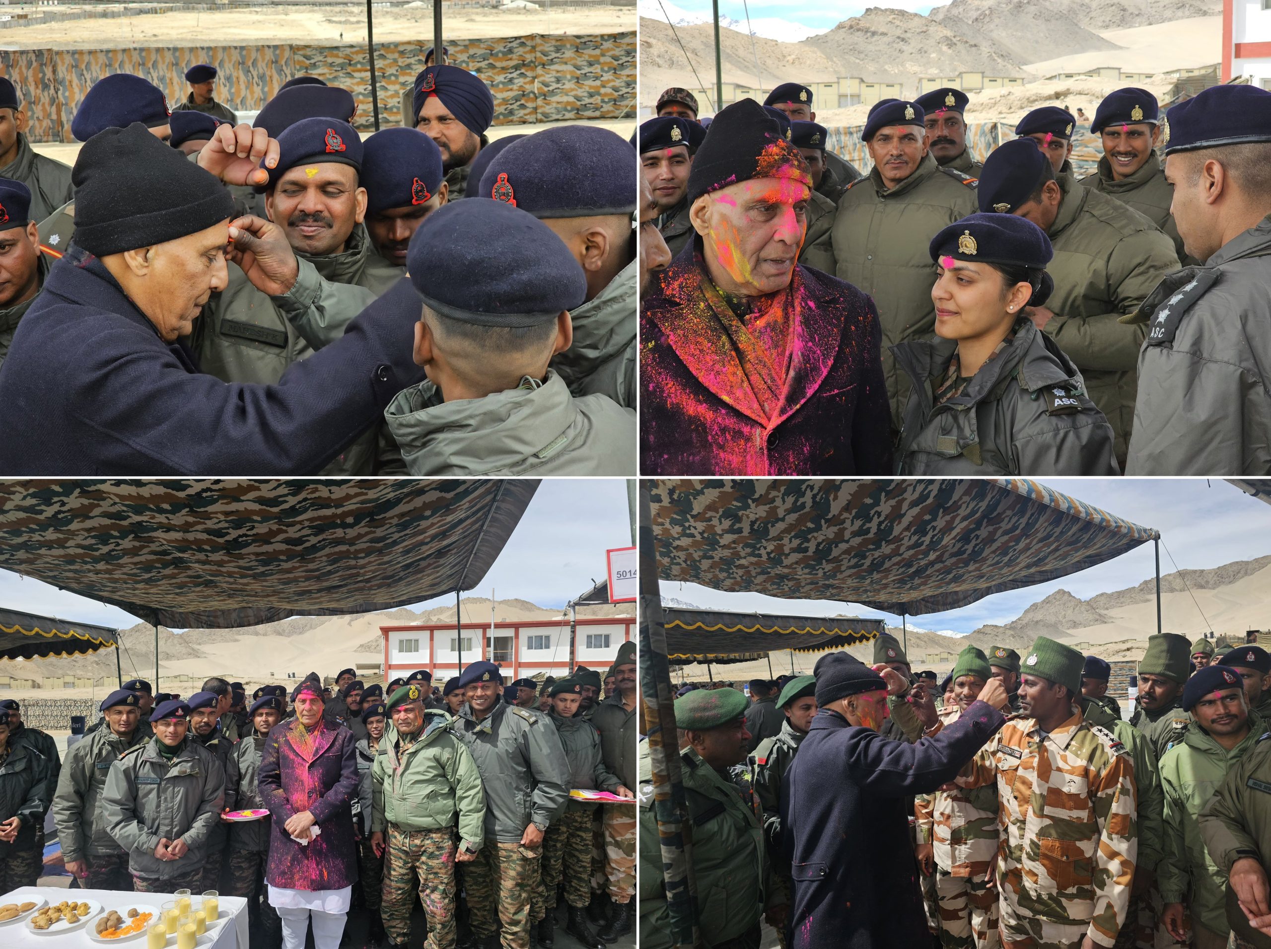 LEH, Mar 24: Defence Minister Rajnath Singh on Sunday celebrated Holi with Army jawans in Leh and lauded them for protecting the country from enemies while braving extreme weather conditions.