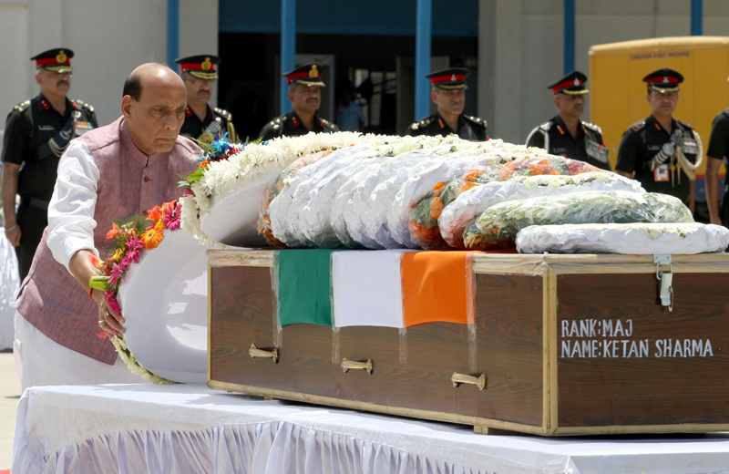Defence Minister Rajnath Singh laying wreath on the mortal remains of Major Ketan Sharma at Palam Technical Area in New Delhi on Tuesday. (UNI)