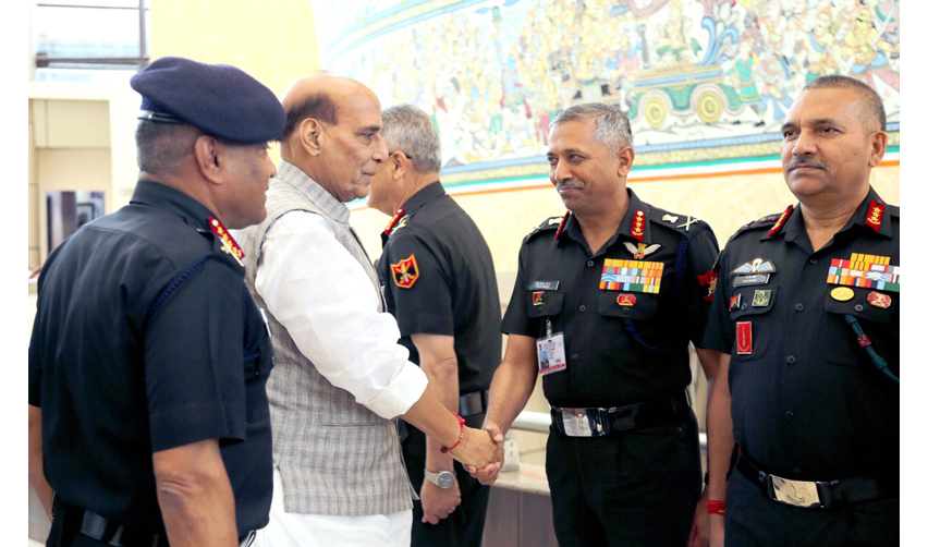 Defence Minister Rajnath Singh meeting Army commanders prior to his address at the Army Commanders conference in New Delhi on Wednesday. (UNI)