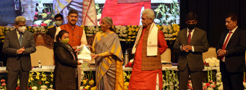 JAMMU, Nov 23: On the 2nd day of her visit to Jammu & Kashmir, Union Finance & Corporate Affairs Minister, Nirmala Sitharaman along with Lieutenant Governor, Manoj Sinha today attended the Credit Outreach programme and other events organized by Banker’s Committee of the J&K UT held at General Zorawar Singh Auditorium Complex, University of Jammu.