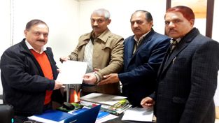 A delegation of DVM submitting a memorandum to Commissioner Secretary, PHE, Irrigation & Flood Control, Dr Pawan Kotwal, for Governor N N Vohra.